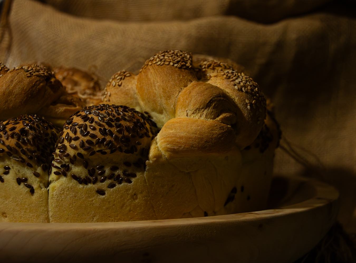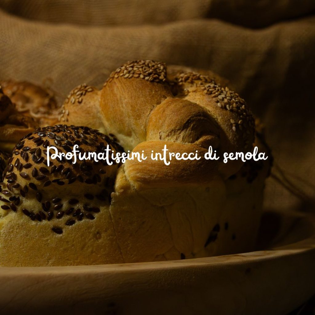 Pane preparato con due farine (grano tenero per medie lievitazioni e semola rimacinata), cotto nella teglia rotonda a bordo alto, forma “Danubio” con decori intrecciati e semi misti.