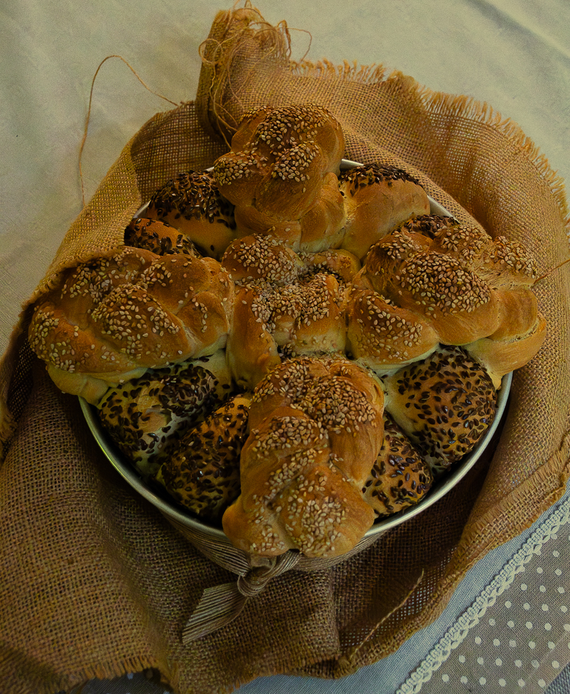 - Mettere un po’ di semi di lino in una ciotola e i semi di sesamo in un’altra ciotola. Bagnare con poca acqua le palline e adagiarle sui semi di sesamo. Fare lo stesso con le trecce al fine di decorarle con i semi di lino.