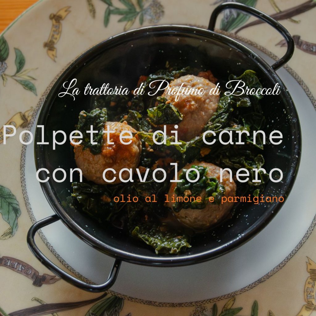 Un piatto degno della cucina di Profumo di Broccoli! Ci sono i cavoli, anche quelli che la maggior parte delle persone non vuole mai assaggiare; ci sono le deliziose polpette di carne che mi ricordano la mia mamma; c’è la semplicità confortante e c’è un servizio sulla tavola rustica della trattoria di casa, come piace a me. Oggi manca solo la tovaglia a quadri, però c’è il raffinato tocco dell’olio aromatizzato al limone che dona freschezza. A seconda dei gusti, manca solo una spolverata di parmigiano.
