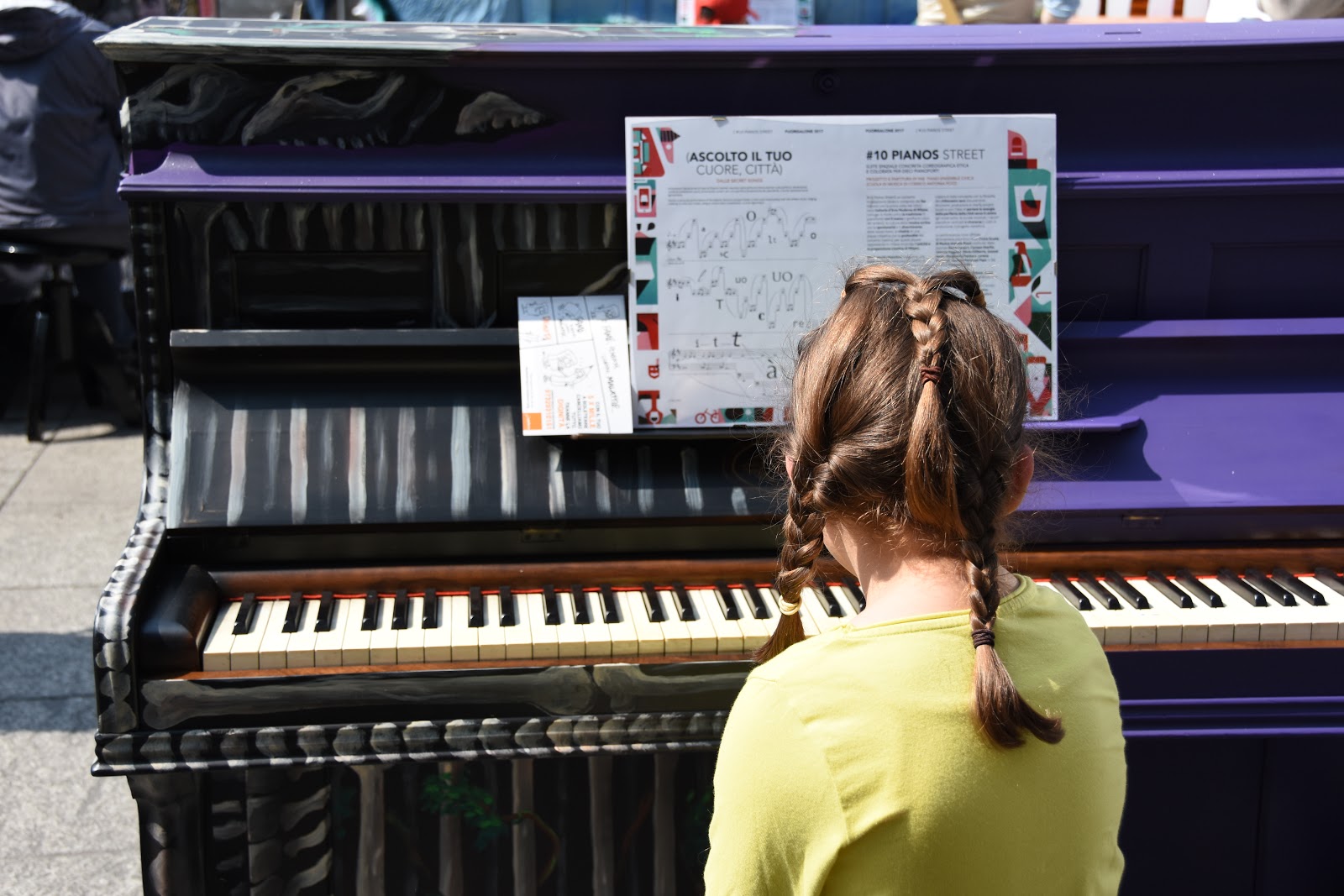 Come vedete dalle foto che ho scattato, i pianoforti sono molto peculiari perchè vengono dipinti da alcuni writers, donando colori e vivacità unici. Si tratta di pianoforti recuperati che vengono poi messi all’asta, devolvendo il ricavato ad associazioni benefiche. Quest’anno la base d’asta è di 3.500 euro (volutamente alta per lo scopo sociale dell’iniziativa) e il ricavato è dedicato a Sole Terre Onlus.